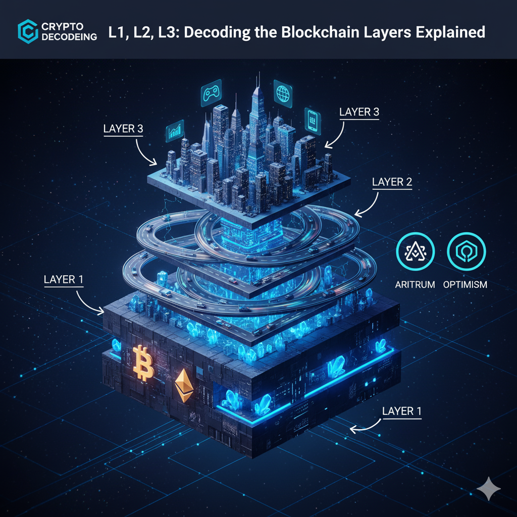 What are L1, L2, and L3 blockchains? Understand the base layer (Ethereum, Bitcoin), scaling solutions (Rollups, Sidechains), and the application layer that powers dApps.