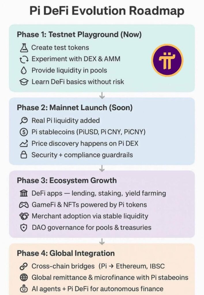 The Pi DeFi Evolution Roadmap is a clear, multi-stage strategy that shows Pi Network’s intent to be a serious contender in the world of decentralized finance. It is a calculated move from a test environment to a globally integrated, AI-enhanced financial platform.